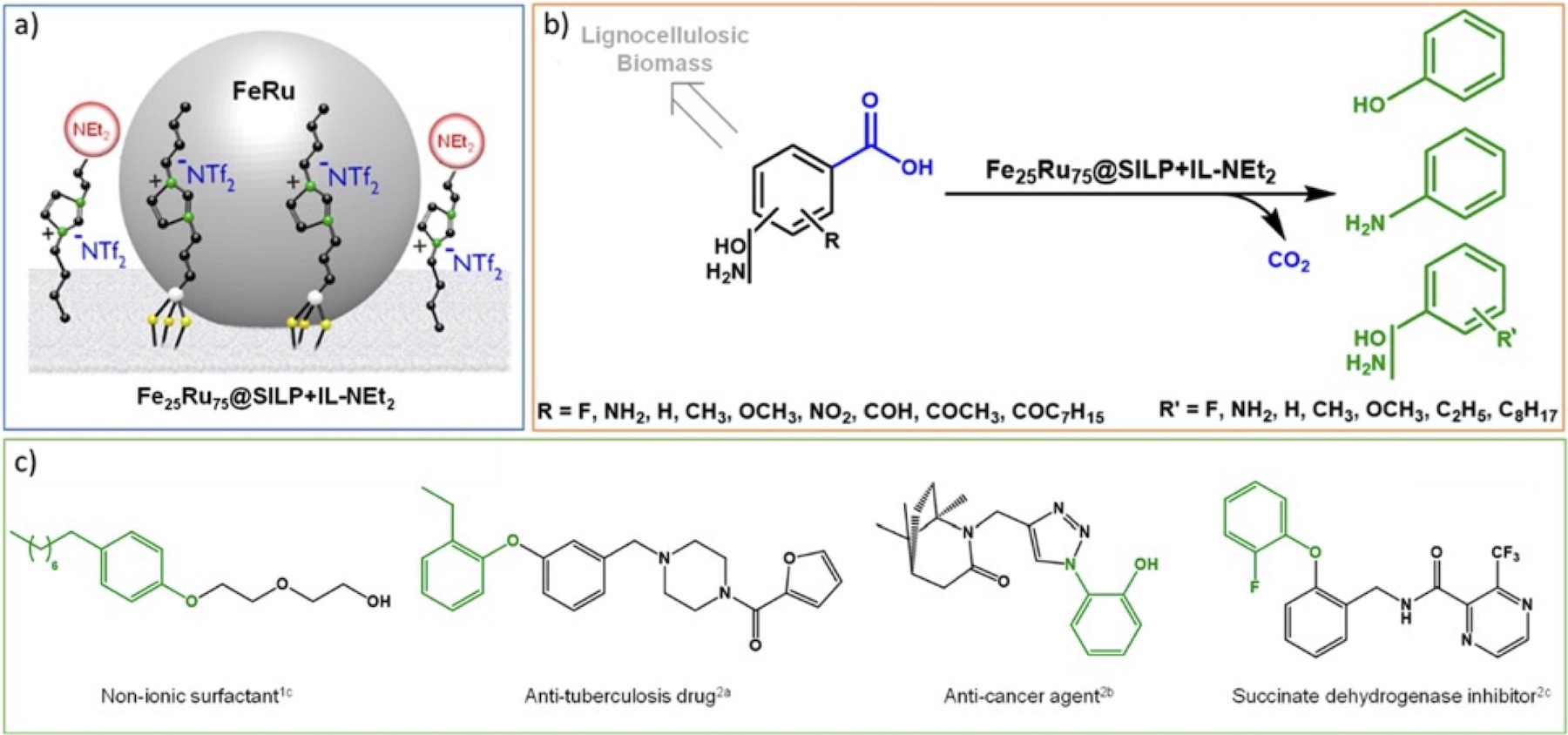 Figure 1: Multifunctional Catalyst Concept and Applications. (a) Structural illustration of the bifunctional Fe₂₅Ru₇₅@SILP+IL-NEt₂ catalyst combining metal nanoparticles with basic ionic liquids. (b) Selective decarboxylation of lignin-derived aromatic acids into phenols and anilines. (c) Example applications of the resulting phenol derivatives in surfactants, pharmaceuticals, and agrochemicals.
