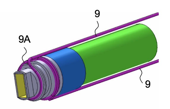 Fig. 3: Faserbündel (grün), teilweise mit Mantel (blau) umhüllt, Anschlussstück (grau) an einem Ende des Faserbündels, und Heizleiter (9,9A)