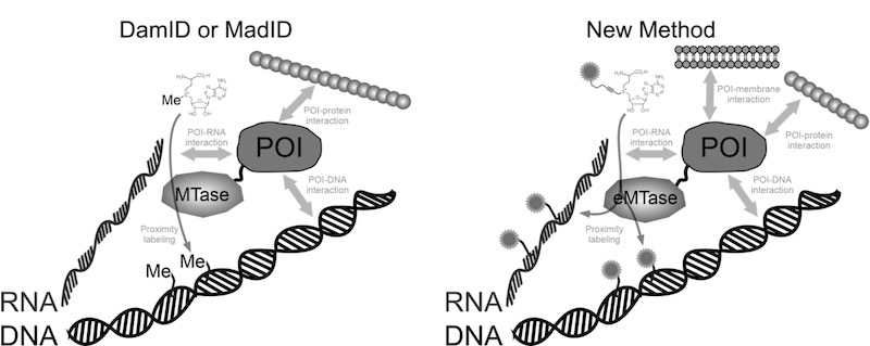 Figure 1: Comparison of traditional DamID/MadID approaches and the new engineered methyltransferase (eMTase) method for detecting protein–nucleic acid interactions. Unlike sequence-specific labeling with natural cofactors, the engineered enzyme uses SAM analogues to covalently tag both DNA and RNA in proximity to a protein-of-interest (POI), enabling stable, high-density labeling and detection via microscopy, sequencing, or optical mapping.