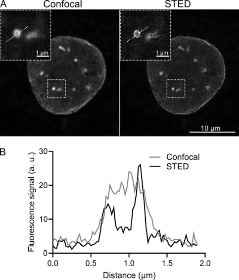 Figure 2: Super-resolution imaging of nucleic acids labeled by engineered EcoGII (W46A) methyltransferase targeted with antibody-protein A/G fusion. Confocal and STED microscopy show fluorescent labels deposited in proximity to lamin B1 at the nuclear periphery. The line intensity profile demonstrates improved spatial resolution and structural detail in STED compared to confocal imaging.
