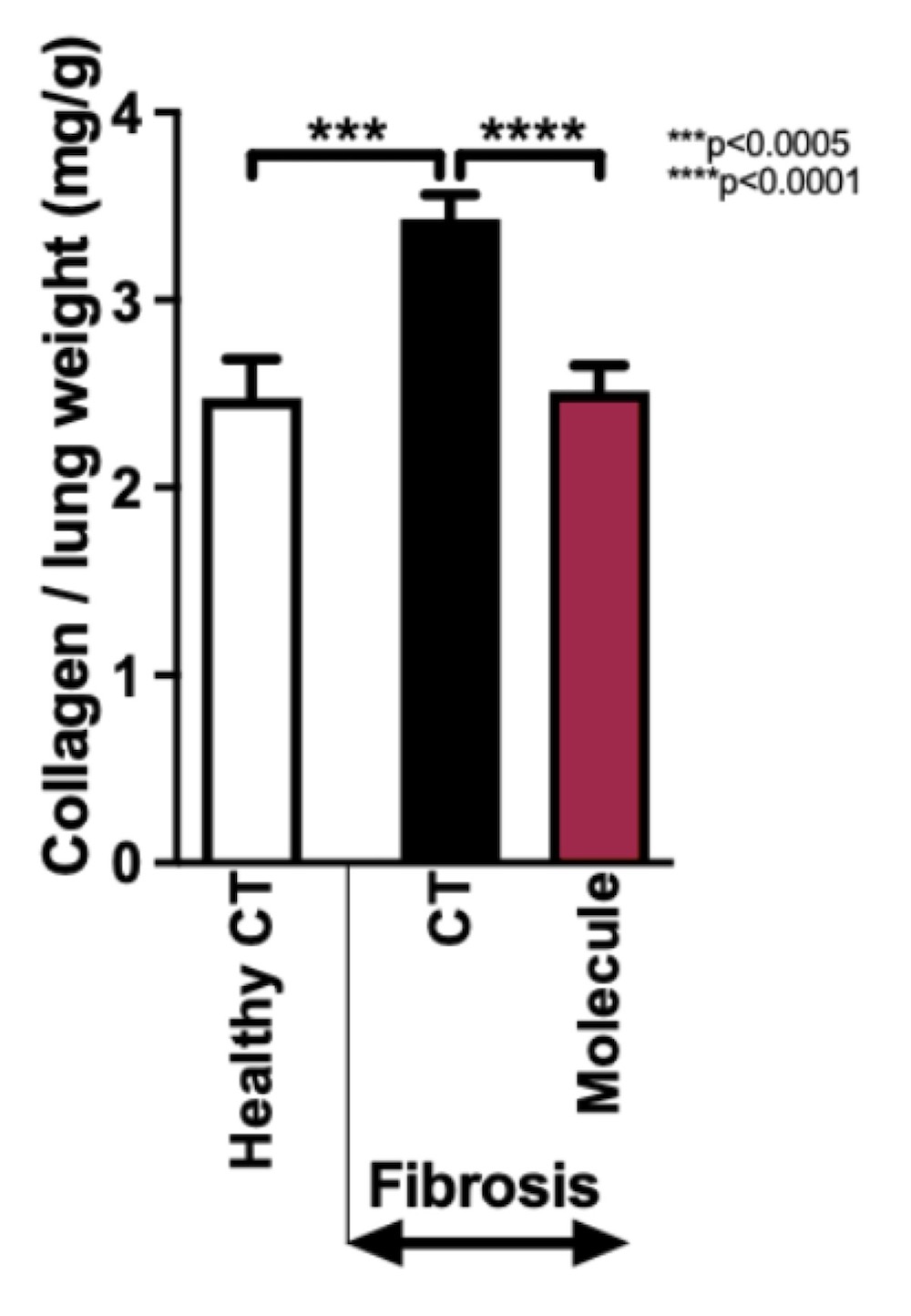 Figure 1 Treatment suppresses lung fibrosis. Treatment ("molecule") diminished collagen accumulation in the lung compared to fibrotic mice receiving 0.9% NaCl. Hamelmann et al. 2025, BioRxiv