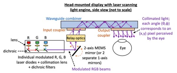 Figure 1: Schematic of a laser-scanning AR display: Modulated RGB laser beams are combined and scanned by a 2-axis MEMS mirror, then directed via relay optics into a waveguide combiner. The waveguide projects collimated light to the eye, forming an image based on beam angles.
