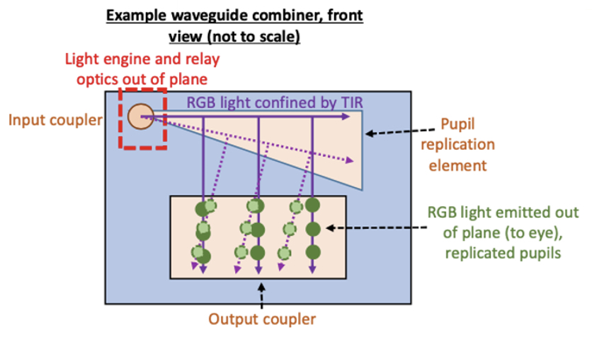 Figure 2: Front view of a waveguide combiner: RGB light enters via the input coupler, propagates by total internal reflection, and is replicated by pupil elements before exiting through the output coupler toward the eye.